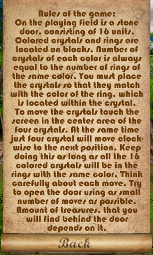 Золото Ацтеків. Путь к сокровищам. The free puzzle game for Android challenges players to complete a series of increasingly challenging tasks, which involve unlocking a stone door with the use of colored crystals. According to an ancient Aztec treasure myth, that was indeed a possibility. The main game mechanic involves a 16 segment grid where you have to match crystals to their respective colored ring by shifting any four elements at a time. You cannot play this game quickly. You must think several steps ahead to use the least number of moves and maximize your bonus rewards.