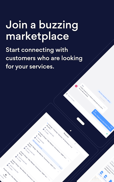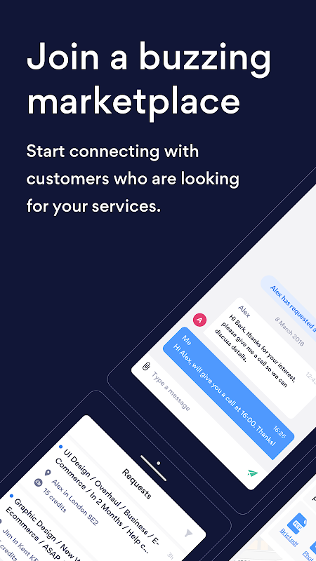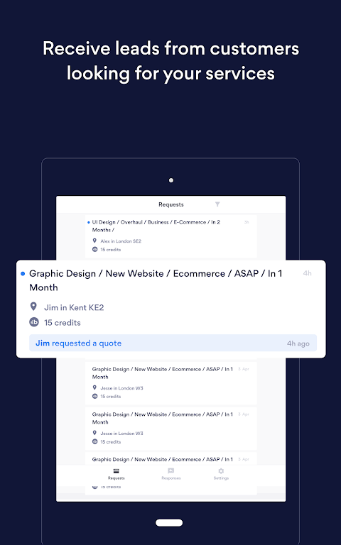 You can keep track of each of your purchased leads, ongoing conversations and follow-ups on a single dashboard of the app. You can choose to filter your requests based on service-type, location, and budget to only see the opportunities that fit your business. This find new clients app design leads you away from not wasting time on unsuitable inquiries and allows smaller businesses to manage costs through selectivity.