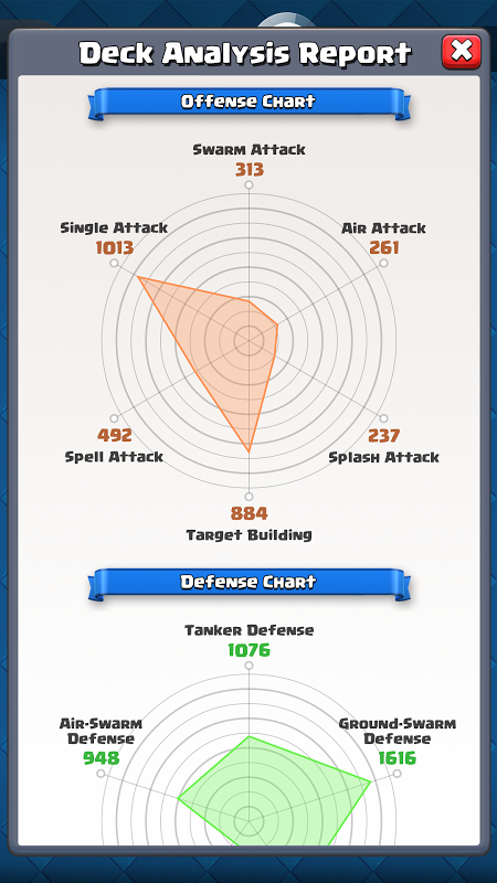 The app examines deck evaluation through multiple angles at once. The strengths of your combat deck, capabilities on attacks, spells and unique attacks, melee-ranged distribution ratio, and aerial-terrestrial attack distribution ratios are calculated in the game. Aside from raw numbers, it generates visual analytics by using pie charts and radar charts that categorize your “eight” cards by tactical role: Swarm, AOE, Push, Support, Distract, and Tank. The evaluation of offense capability will be done on the basis of Charge Attack, Charge Air Attack, Charge Swarm Attack, Charge Splash Attack, Charge Spell Attack and Charge Building Oriented Attack measurement. Defensive Analysis includes Air Push Defense, Ground Push Defense, Air Swarm Defense, Ground Swarm Defense, and Tanker Defense – so you can see how your deck performs in competitive situations.