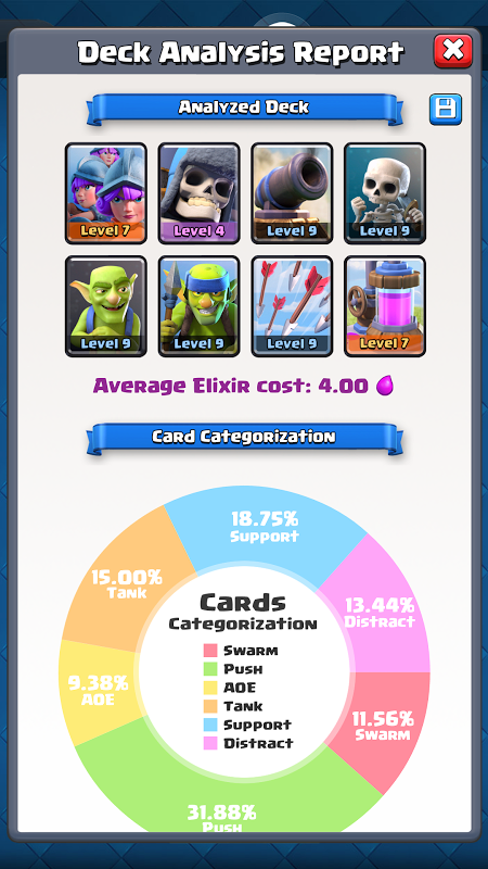 After you analyze a deck, you can export the full report. This allows you to save the report as a PNG image. You can also share it on social media or chat apps. It is great for sharing your «deck statistics analyzer» results with your clan or friends. Deck Library allows you to store the configurations you like the best, and share your deck with one click! The option that supports shortcut in status bar can make it easier. The «battle deck optimizer» functions are all totally free and inside the app, so no in-app purchases or ads will get in your way.