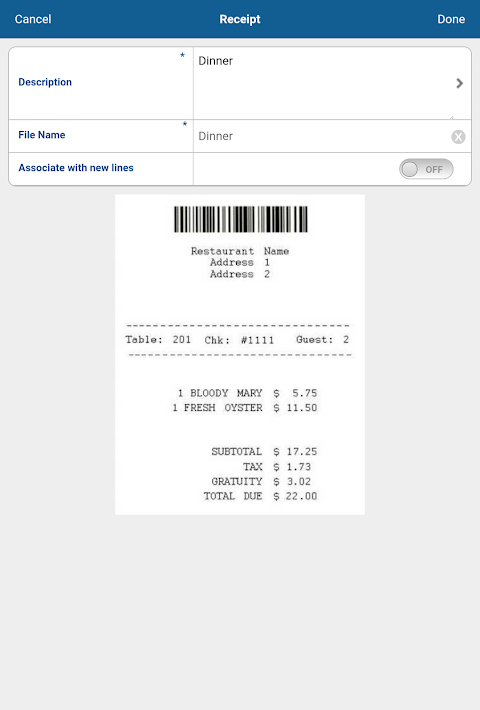 - Quickly snap photos of your receipts right after meals and taxi rides. If you wait any longer, the paper could get lost or the details forgotten.