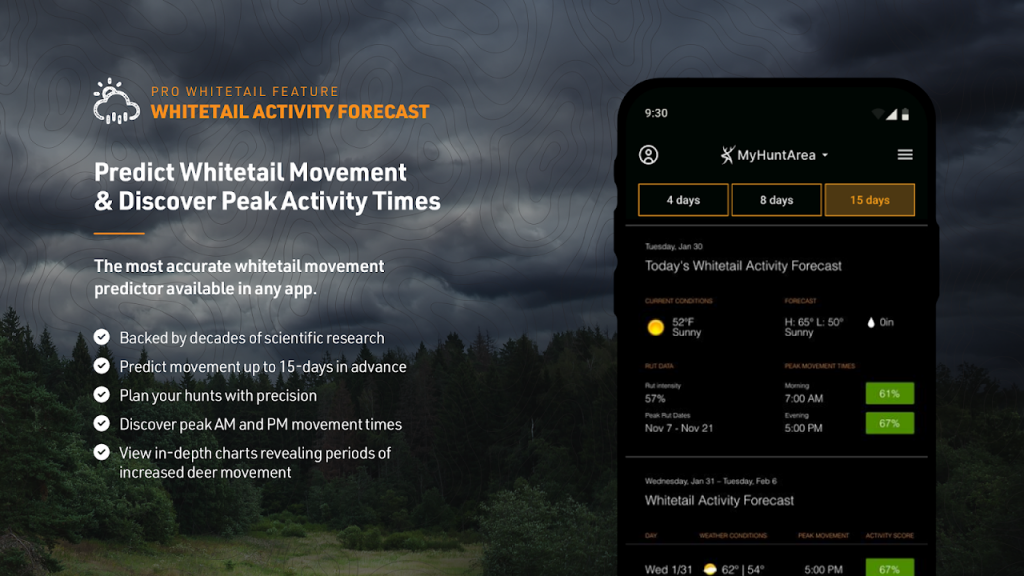 You can easily identify where you’re allowed to hunt and where you aren’t, with overlayed property lines on high-quality satellite imagery. While you’re in the field, our GPS mapping tracks your current location. The custom map editor also allows you to create hunt areas by dropping pins for stands, blinds, feeders or recent sightings. The digital rangefinder gives you distance readings without any other tool and you can keep an eye on changing conditions using weather maps with radar overlays.