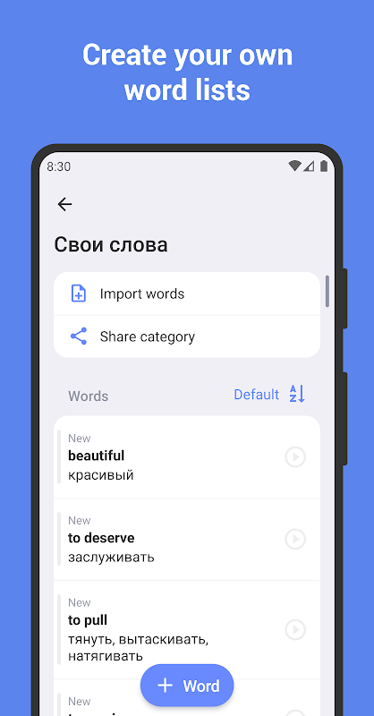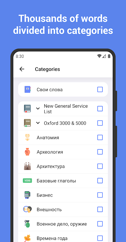 At the heart of the app is access to over 12,000 English vocabulary words and phrases sorted in categories, such as the New General Service List and Oxford «3000» & «5000». This way of using the data allows students to focus on essential vocabulary or topic-related sets to achieve their aims. If you are an ESL beginner or someone looking for the daily English practice, you can jump in wherever you like because the app’s structure won’t force you to read irrelevant material.