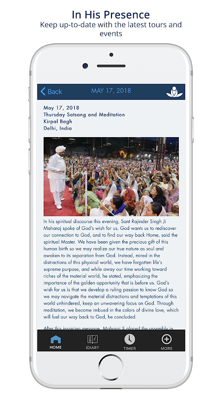 The In His presence section will keep you updated on the master’s tours and overall events taking place around the globe in English, Hindi, and Spanish without having to search manually. It is not a generic library of meditations but rather a feed customized to your tradition.