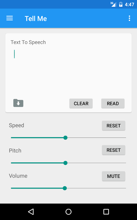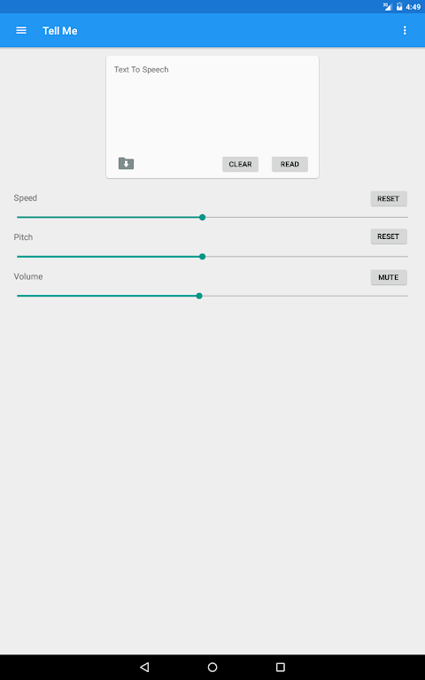 The app has a clean, material design layout with a focus on customizability. You can change volume, pitch, and speed using sliders so you can customize how you want your text to sound. The different voices are English, UK English and Jarvis. They give you a bit of a choice without overdoing it. The slide out menu saves preset text that can be used quickly. This is useful if you repeatedly use the same text.